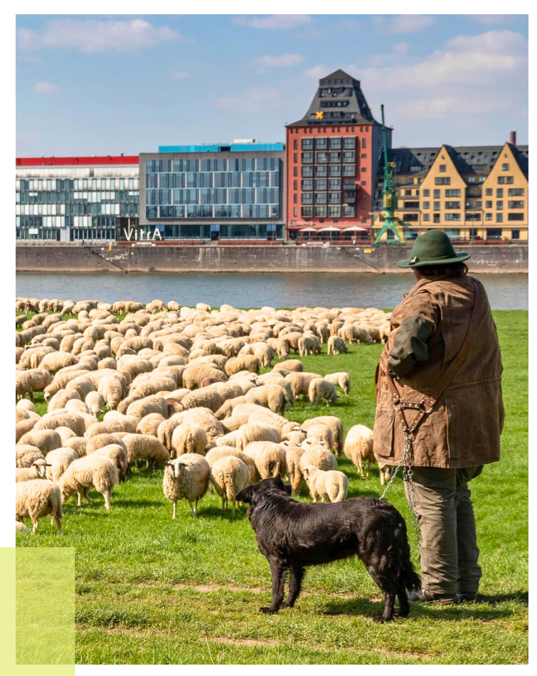Cologne is consistently pursuing its goal of climate neutrality by 2035, relying on concrete, measurable measures. The focus is on sustainable energy supply, climate-friendly mobility solutions, and the systematic integration of climate goals into urban development. Projects such as Deutz Harbor and Parkstadt Süd impressively demonstrate how future-proof, mixed-use neighborhoods can be created – resource-efficient, vibrant, and economically relevant. At the same time, Cologne considers sustainability in every detail: Nature-based solutions such as grazing on the Poller Wiesen meadows combine ecological management through sheep flocks with an urban spatial concept. The protection of water resources, ensuring water quality, and preserving aquatic ecosystems underscore the city’s holistic approach.